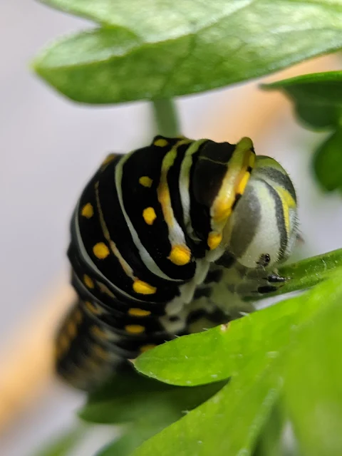 Be careful when buying plants. The parsley in my garden came from the supermarket produce department, so I assumed it was non-toxic. [insert corny saying about ass-u-me] Not long after passing its first frass (poop) the first-born caterpillar died, and it dawned on me that the parsley wasn't clean. Neonicotinoids are systemic pesticides that wreak havoc on larvae. I'm growing exactly one organic carrot (a whole 'nother blog post) so transferred two day-old caterpillars to a carrot leaf, and off to Nick's Garden Center I went in search of new plants. They sell non-GMO 'Titan' parsley, and I found some bronze fennel. I read somewhere that Black Swallowtail caterpillars love it but mine opted for it last, only eating it when they were close to their final molt and ravenous.
